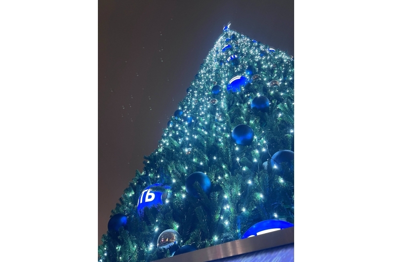 В этот раз в сердце краевой столицы украсили 19-метровую ель. Жители и гости города могут полюбоваться её убранством. На праздничном дереве расположили 64 световые полусферы с логотипами банка, 1 тысячу синих и серебряных шаров. Яркими огнями на ёлке мерцает гигантская гирлянда. Её размер более 2 тысяч метров.