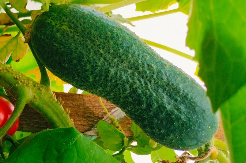 В густой листве легко пропустить переросшие огурцы. А один "желтяк" может замедлить рост новых завязей на всей плети. Поэтому каждое утро осматривайте грядку и собирайте созревшие плоды.