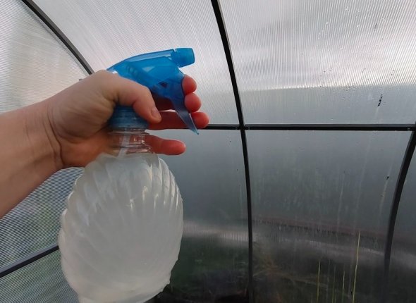 Полученный концентрат следует аккуратно перелить в распылитель и обработать им все поверхности: грунт, каркас и поликарбонат. Рекомендуется использовать около 1 литра раствора на каждый квадратный метр площади.