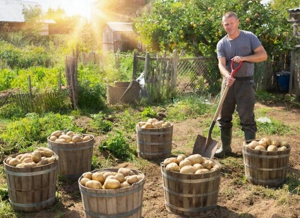 "Я выбрал схему 100 на 100 сантиметров. На 4 сотки размещается 400 кустов, уходит 40 килограммов семян весом по 100 граммов каждый клубень. С куста собираю по 3,2 килограмма при благоприятных условиях — это 1280 килограммов общего урожая картофеля. Переводим в ведра — ровно 160 штук", — делится дачник.